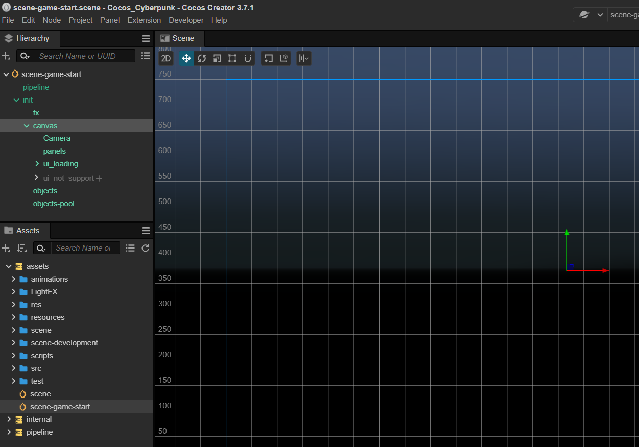 如上图所示,当打开 Cocos Cyberpunk 项目后,可以看到左下角的 Assets 窗口中的文件内容。