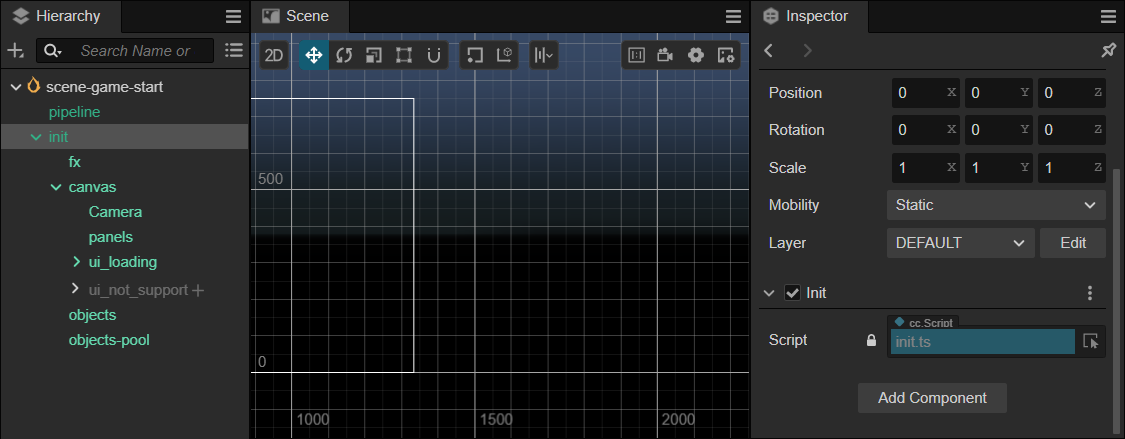 从上图中我们可以看到,init 节点下包含了 fx、canvas、objects-pool 等节点。 从名字可以看出,这些节点分别对应特效、UI、对象池。