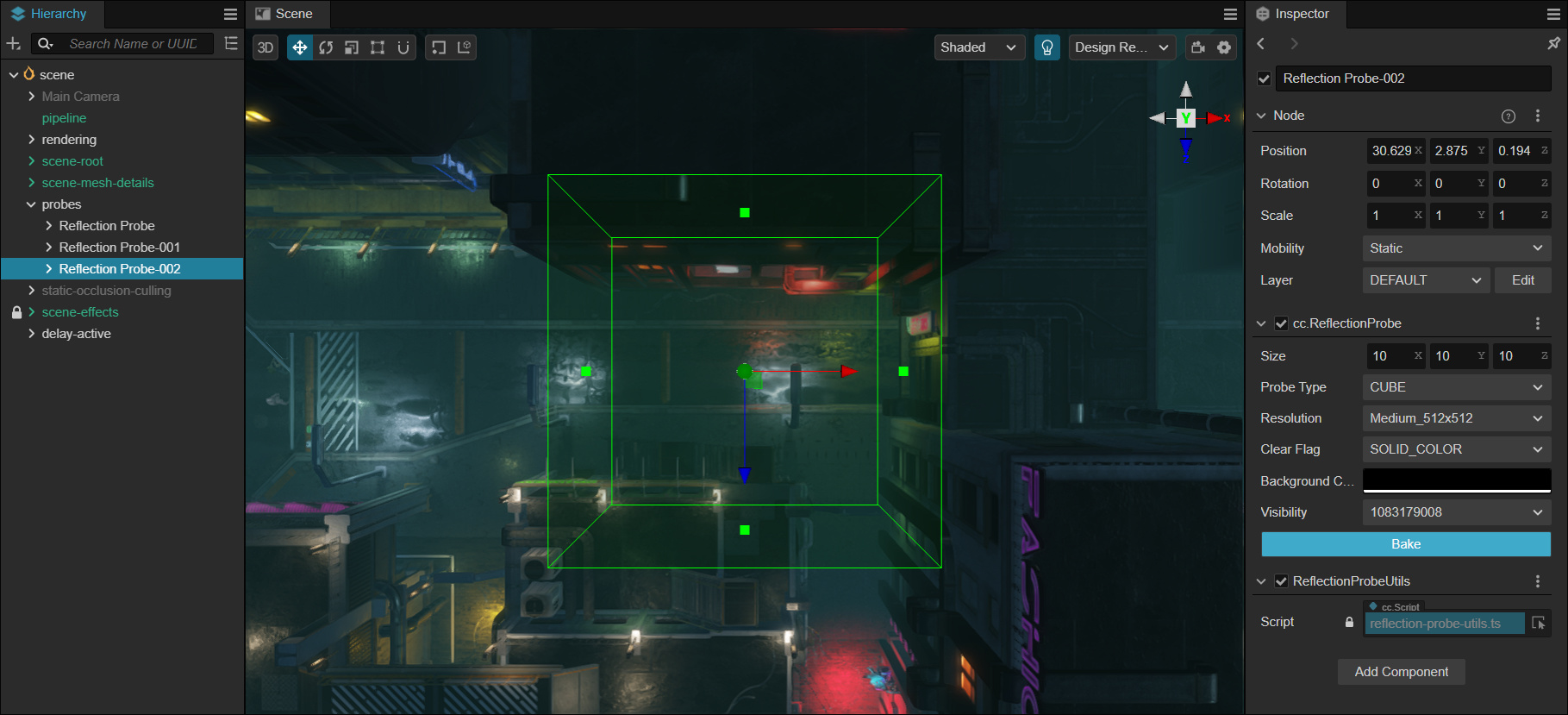 可以看到,在反射探针节点上还挂了一个 ReflectionUtils 脚本组件,这个组件提供了实时更新探针的功能。