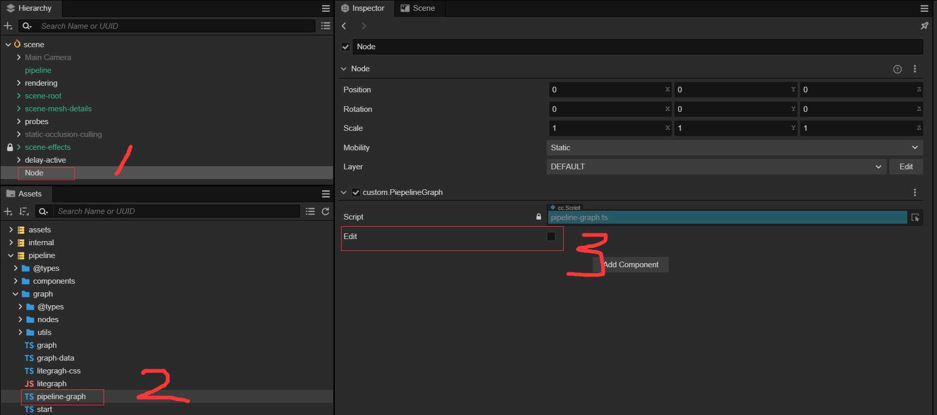 想要查看可视化的 pipepline 管线图,只需要在场景中新建一个节点,并把 pipeline/graph/pipeline-graph.ts 组件拖给新建的节点。