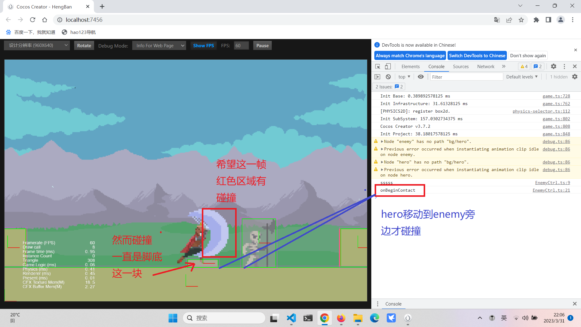 然而实际运行,挥刀没有碰撞,只有主角移动到敌人旁边发生碰撞