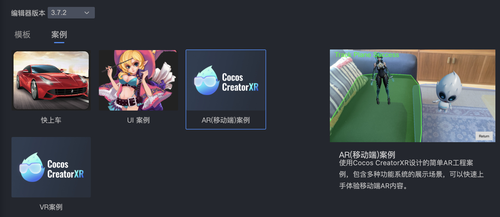 可以下载最新的Cocos Dashboard安装最新的3.7.2 Cocos Creator,直接在案例里创建AR/VR应用。