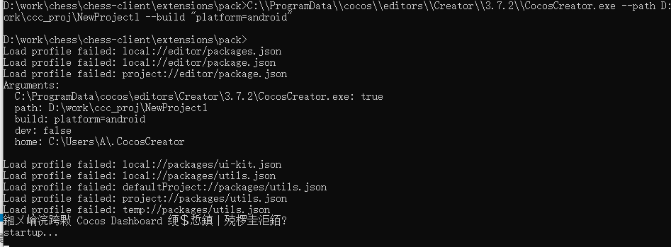 附完整命令:C:\ProgramData\cocos\editors\Creator\3.7.2\CocosCreator.exe --project D:\work\chess\chess-client --build “platform=android;configPath=D:\work\chess\chess-client\extensions\pack\config\buildConfig_android.json”