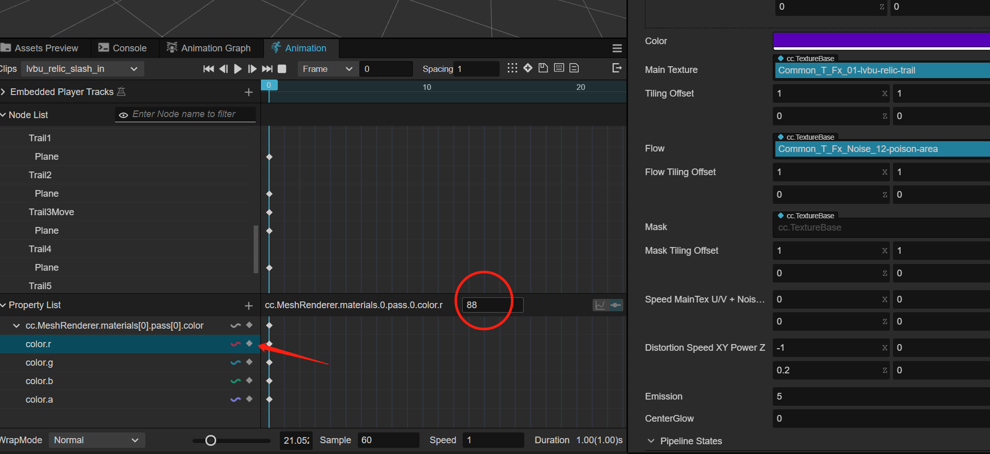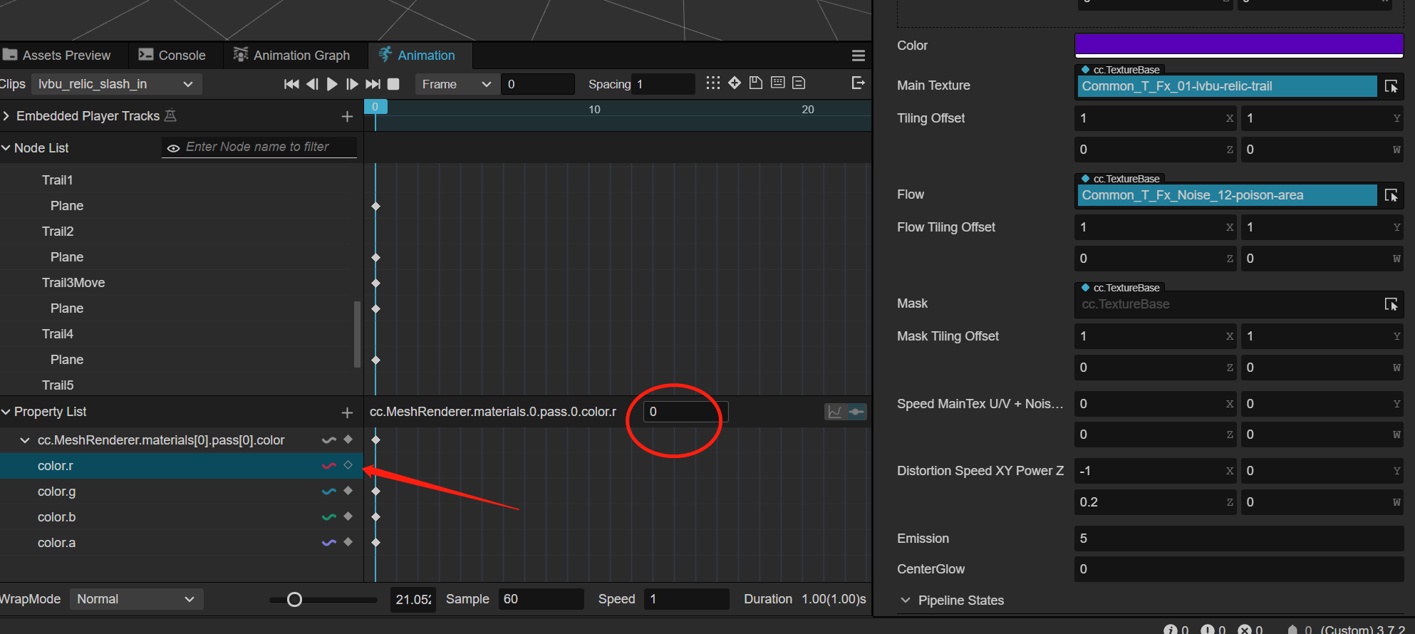 如图,本来r通道的值是88,由于我只想对a通道做动画,于是把r通道的关键帧取消。点取消的一瞬间,自动把我的r通道的值改为0…