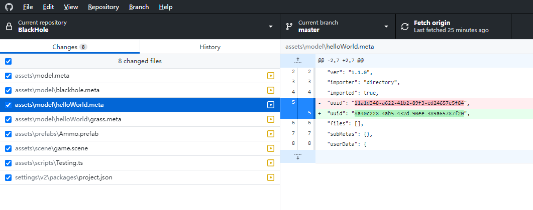 首个报错:Creator里正常操作,准备git commit时发现莫名其妙多了很多的文件改动,观察是发现一个文件夹(所有的操作从始至终并未碰触这个文件夹)被拷贝到了另外一个文件夹里,于是使用git discard掉所有相关的移动,只保留自己编辑scene的内容,然后实际的拷贝文件的确被还原了,但是被拷贝而导致新复制的文件夹目录(文件夹,文件夹meta)一直存在并显示在Assets的文件目录结构里;并且被复原的实际文件(两个model)的UUID也自动发生了变化,并且这两个model在Assets Panel里不再显示但在硬盘中实际存在;然后又用git取消这些UUID的变化,再切回Creator,UUID再次自动发生变化,git取消再切回Creator再次改变,死循环。