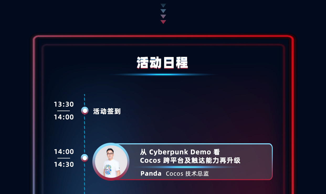 Cocos Creator 3.7 发布后,渲染、光照、易用性以及性能得到了进一步提升。官方 Demo Cocos Cyberpunk 也随之正式开放,开发者可以免费下载到所有工程源码和美术资源,进一步感受 Cocos 在 3D 能力上的进展与突破。本次上海沙龙,Cocos 引擎技术总监 Panda 将以 Cocos Cyberpunk Demo 为出发点,深入解析 Cocos 在跨平台和触达能力取得的最新进展,以及为开发者带来了哪些可能性,希望有越来越多的开发者使用 Cocos 制作出精彩纷呈的作品。