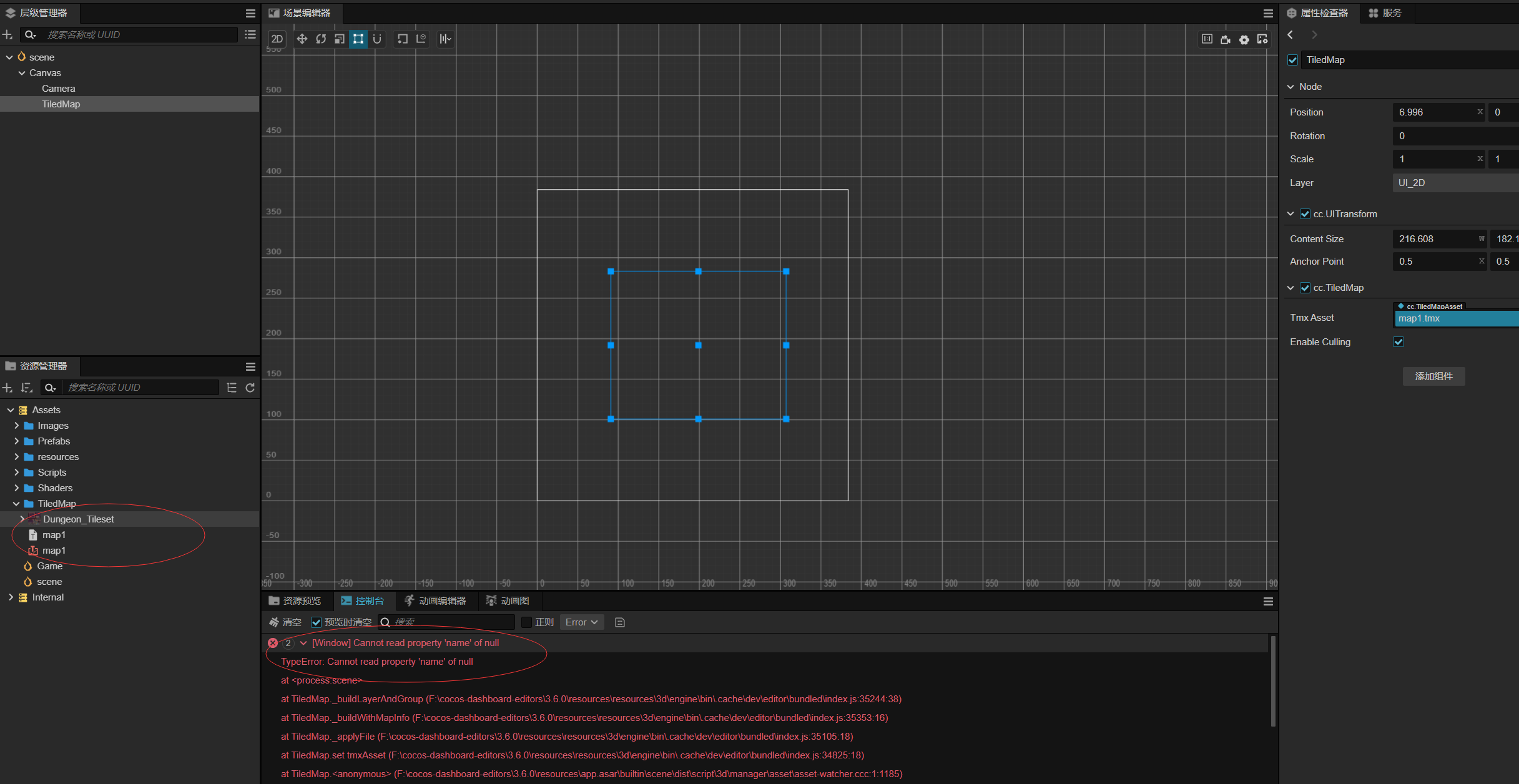 tiledMap高版本都不行,有时候在tiled随机编辑保存把tmp替换掉,界面不是变紫就是报错.