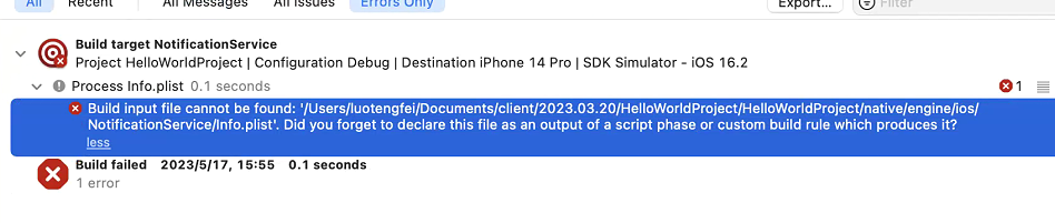 现象:使用cocos3.5.2创建了一个Xcode helloworld工程,只要添加NotificationService,就会出现NotificationService/info.plist路径异常问题。在本地修改了NotificationService/info.plist的路径为绝对路径后,虽然模拟器运行不会报错,但是运行Archive必会报错,依旧是找不到NotificationService/info.plist。