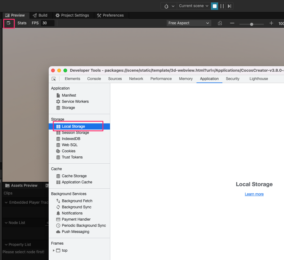 目前在 Preview In Editor 模式下, 无法通过 dev tools 查看到 web api 形式的 local storage