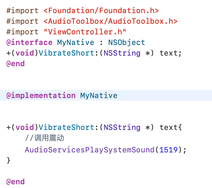然后在ts中调用 native.reflection.callStaticMethod(“MyNative”, “VibrateShort:”, “test”);