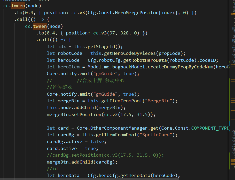 tween中套tween的场景为没遇到过,不过你最外层的两个tween如果是同一个target的话,可以把call去掉然后把第二个tween拿到后面来。你可以先试一下这样能不能正常,然后再调第三层那个mergeBtn