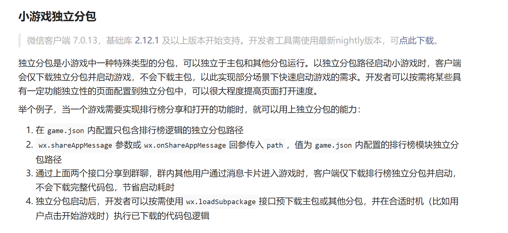 还有就是试玩文档中有启动独立分包的代码