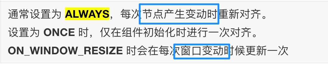 你好,2.4 ALWAYS 是每一帧都会调用的,3.x 后来进行了优化,但是考虑到使用习惯所以命名保留了下来。话说回来,这里从命名上来说其实也没什么问题,AlignMode 表示“对齐模式”,always 强调的是始终对齐这一结果。不论底层是否用了 dirty check,结果就是始终对齐。