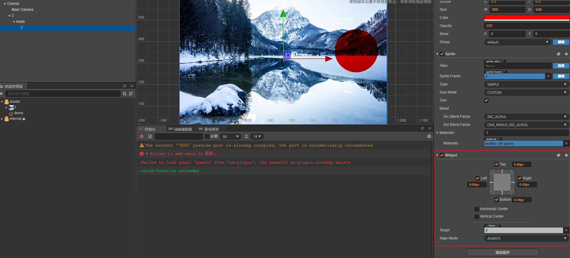 2.x中,上方图片节点结合mask遮罩节点组件,然后下面的图加上widget组件,可以实现拖到mask节点,看到下面的图的效果。 编辑器如下: