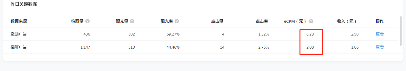 曝光率太低了,广告提前拉,要的时候就可以直接放出来了,不然还要等加载。可以提升一点曝光量和ecpm。另外广告质量也和你游戏体量有关系,广告质量高ecpm才能高。不过到30就别想了,买量一个点击能出两三块钱就不错了,他不要钱全部给你也不会超过30的。
