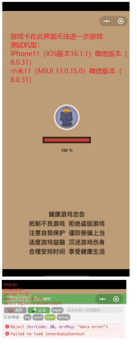 ##############对了,微信官方回馈错误如下图,发现有个innerAudioContext错误,但我试过把游戏的声音相关的都剔除后进行云测试,还是有苹果手机卡死100%