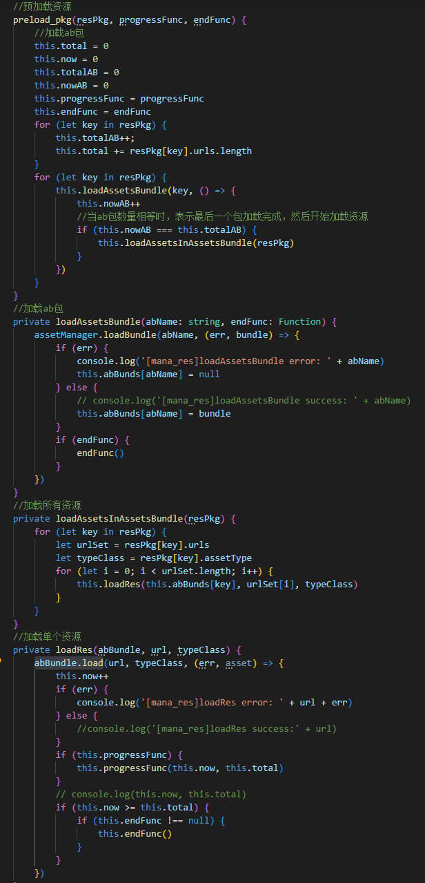 所以,再根据resPkg里面写死的路径,分别加载每一张图片、声音、预制体等资源,都用abBundle.load()加载一遍,具体代码如下:
