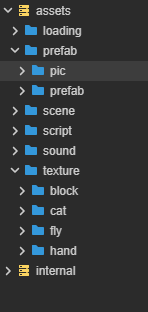 1,cocos里面的文件结构如下,其中prefab,sound,texture这3个文件夹设为小游戏分包