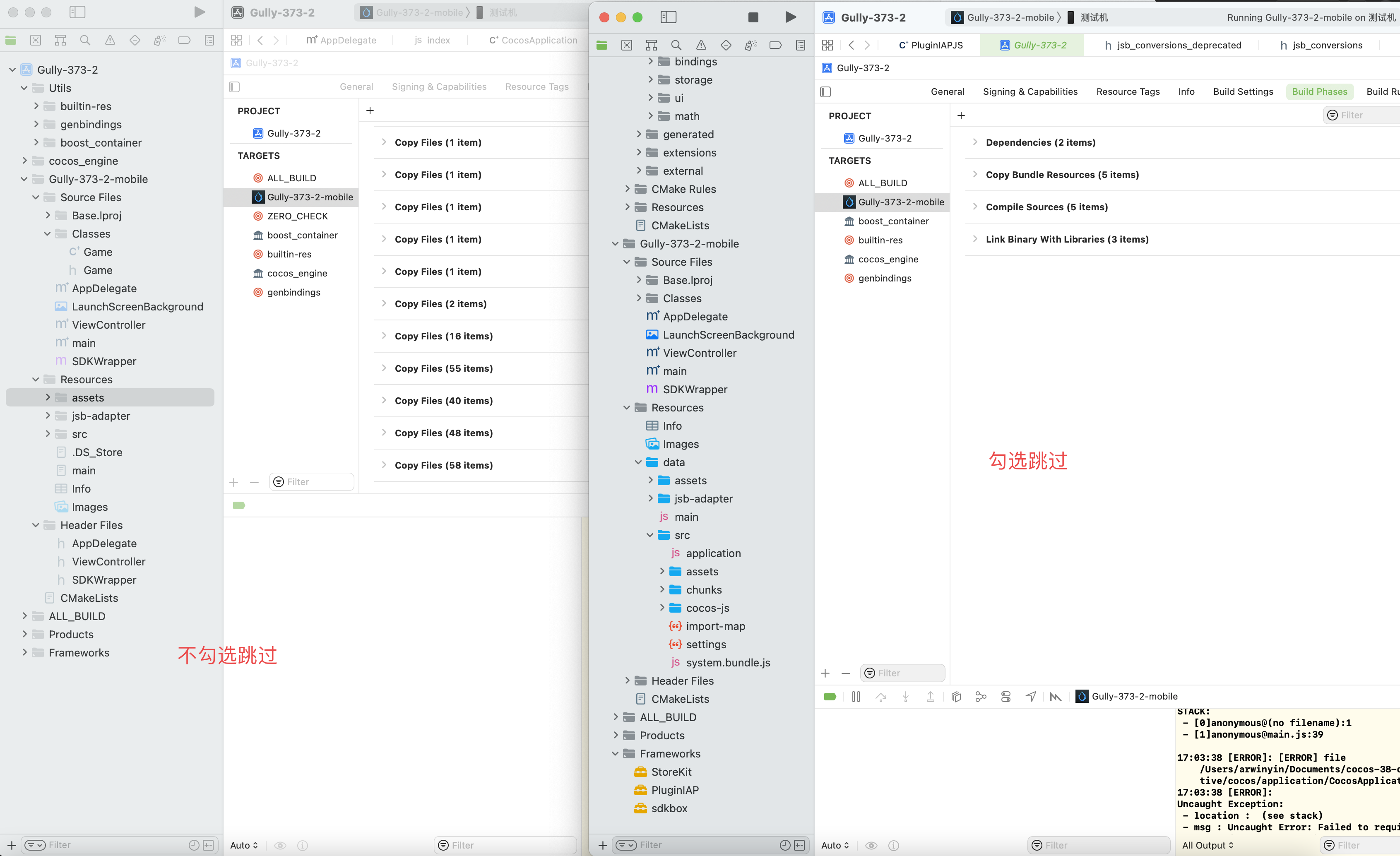左边的build phases一点,会卡好一会,下面内容很多,是不是cmake生成的?而右面则没这个问题,但它启动了后进不去也不行啊。。