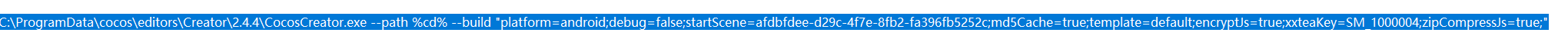 命令行执行 C:\ProgramData\cocos\editors\Creator\2.4.4\CocosCreator.exe --path cd --build “platform=android;debug=false;startScene=afdbfdee-d29c-4f7e-8fb2-fa396fb5252c;md5Cache=true;template=default;encryptJs=true;xxteaKey=SM_1000004;zipCompressJs=true;”