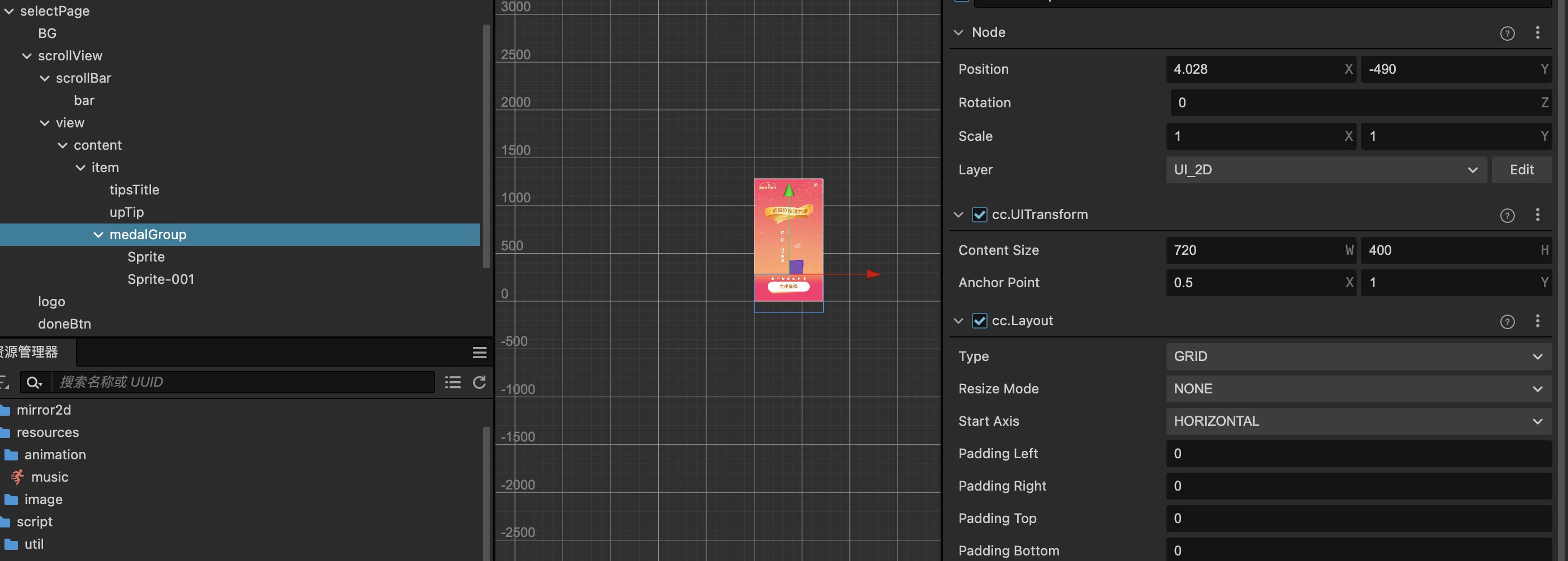 scrollView通过代码设置node,结构上item中两个静态node加上一个动态node,动态node为图中group,下面两个Sprite是为了测试,