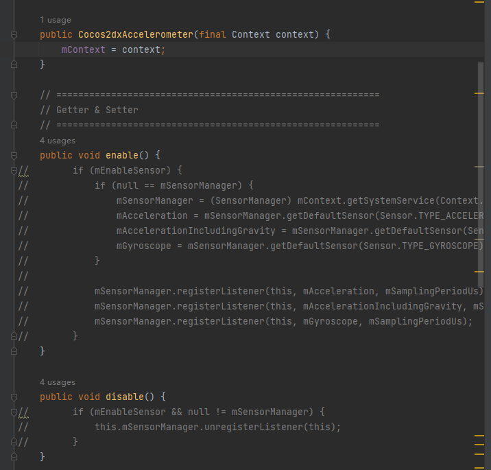 Cocos2dxActivity.java里面确实是有这句话 mCocos2dxOrientationHelper = new Cocos2dxOrientationHelper(this); 要注释掉吗?还是?