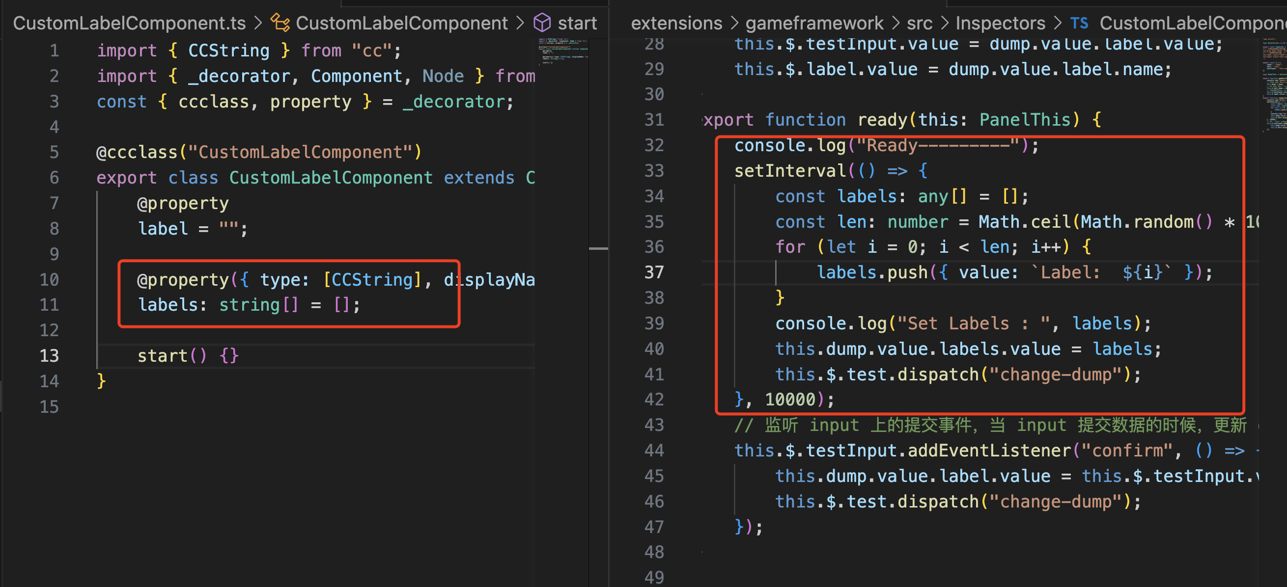 参考官方示例:自定义属性检查器面板 · Cocos Creator 增加了一个labels的属性,然后在inspection中对这个labels属性赋值,但是没有成功: