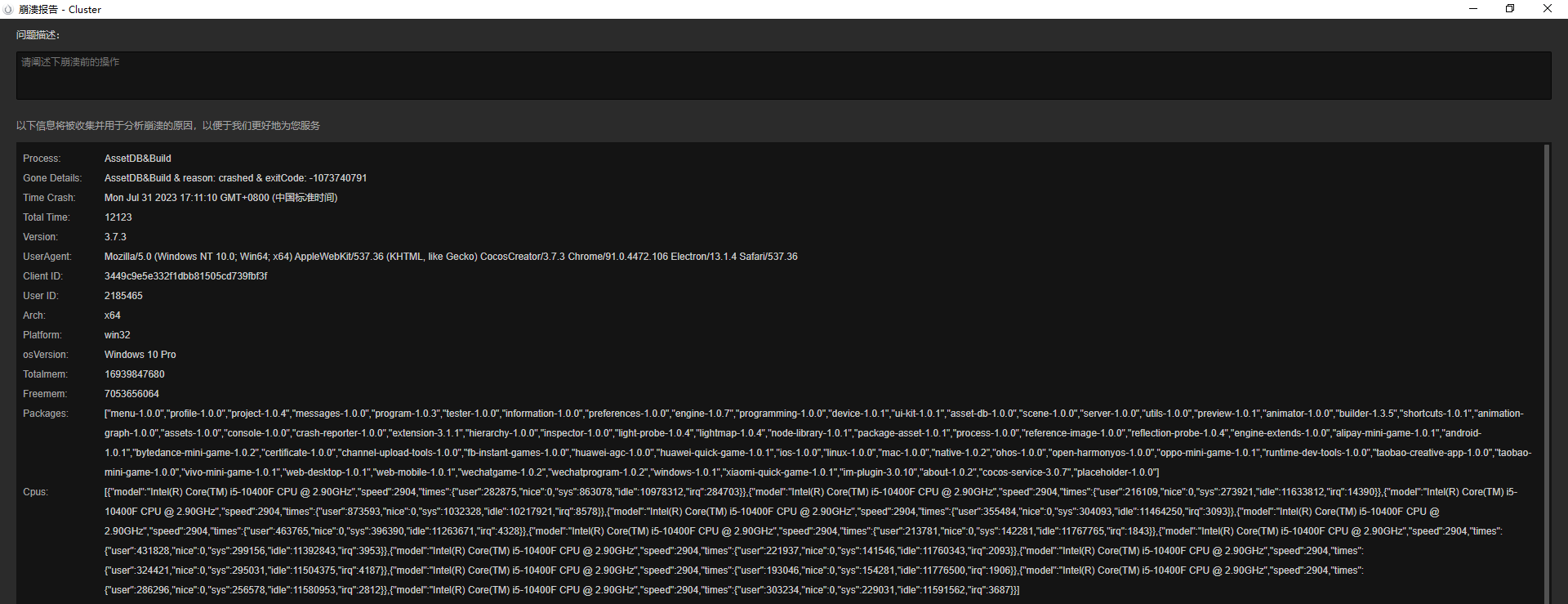 看了下崩溃的 exitCode,好像和权限和写入有些关系,看看能不能给 CocosCreator.exe 管理员权限,然后试试将项目目录改成可读可写可运行的权限(777)