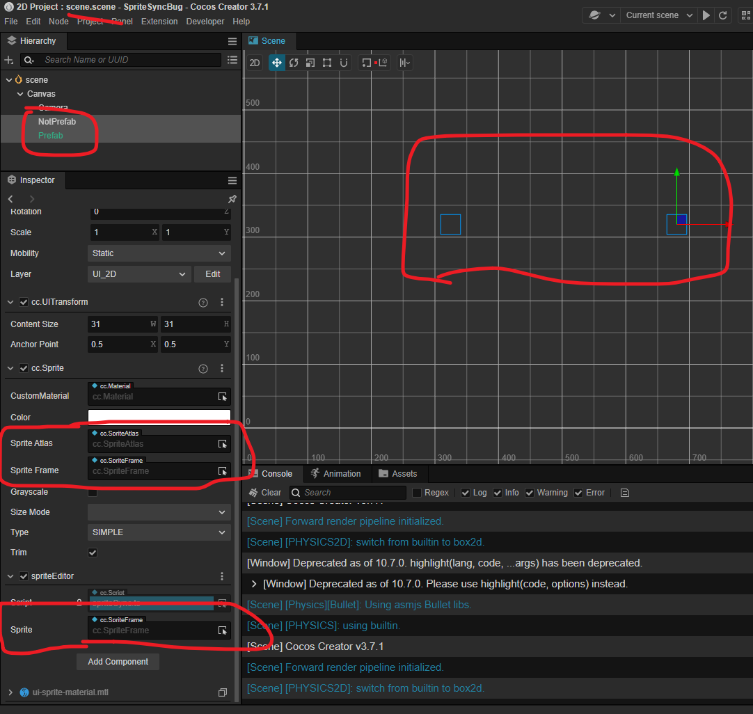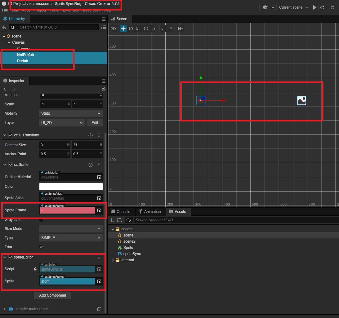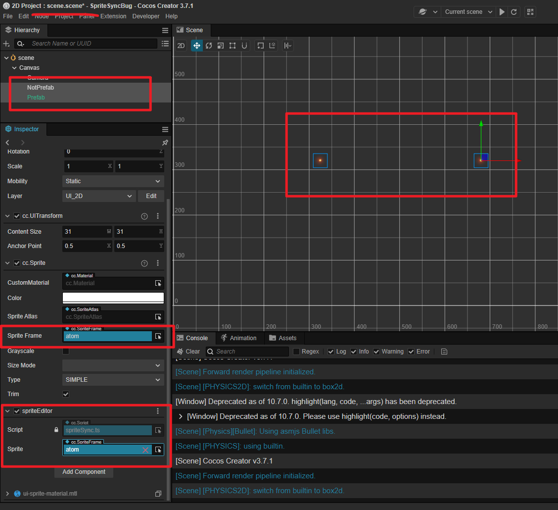问题就出现了,NonPrefab 的 spriteFrame 依旧是 atom,那个 Prefab 的 spriteFrame 属性现在为空了。
