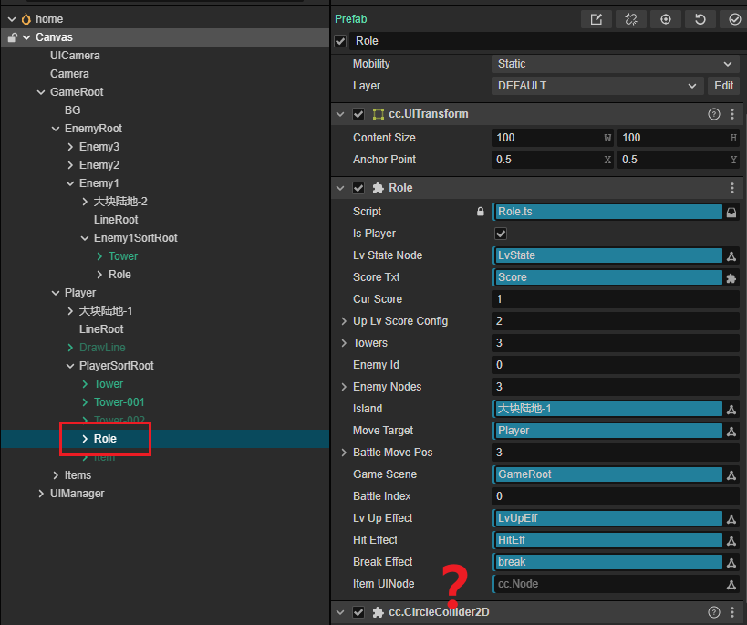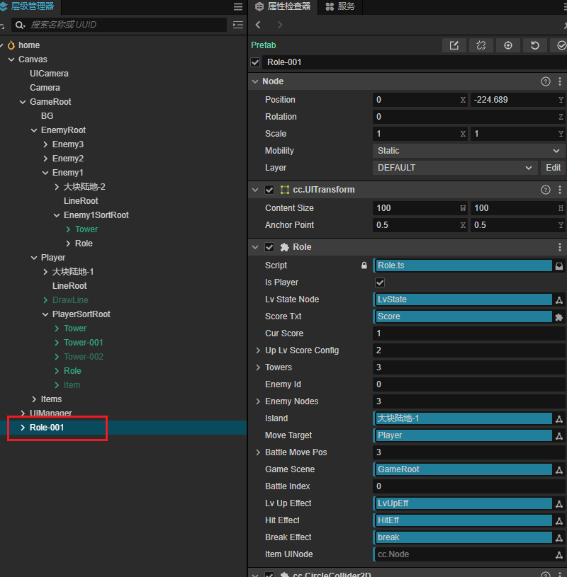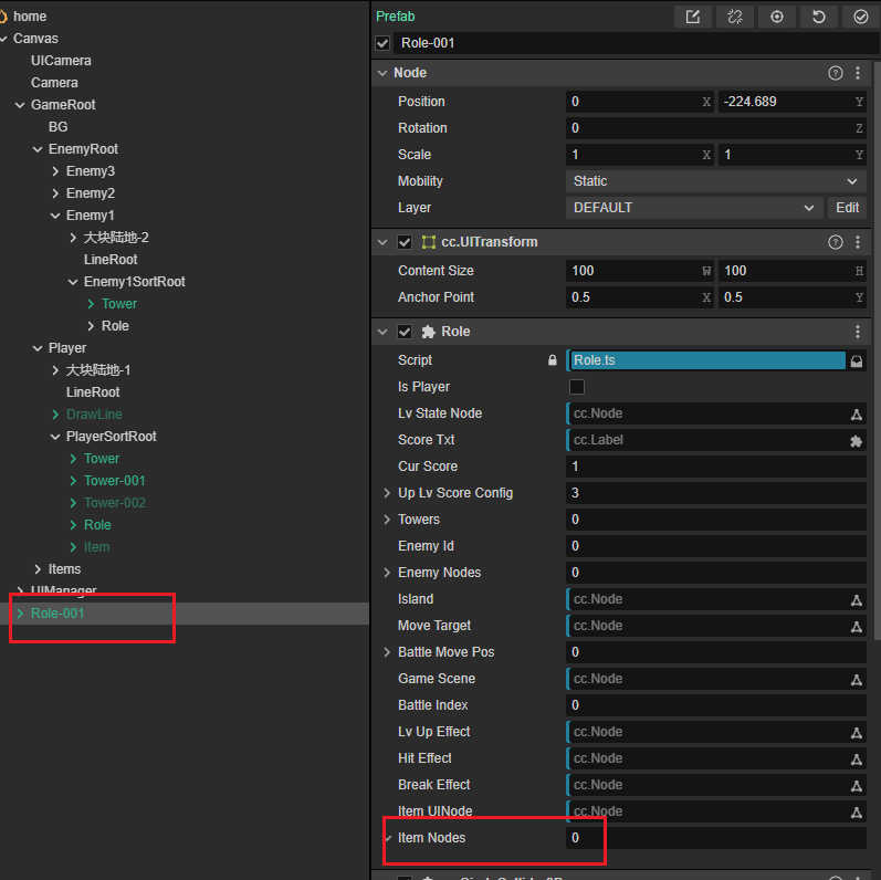 麻烦问一下,Role 这个节点是普通节点还是预制体(Prefab),或者可以给一下复现的步骤,我们这边好尽快复现并修复