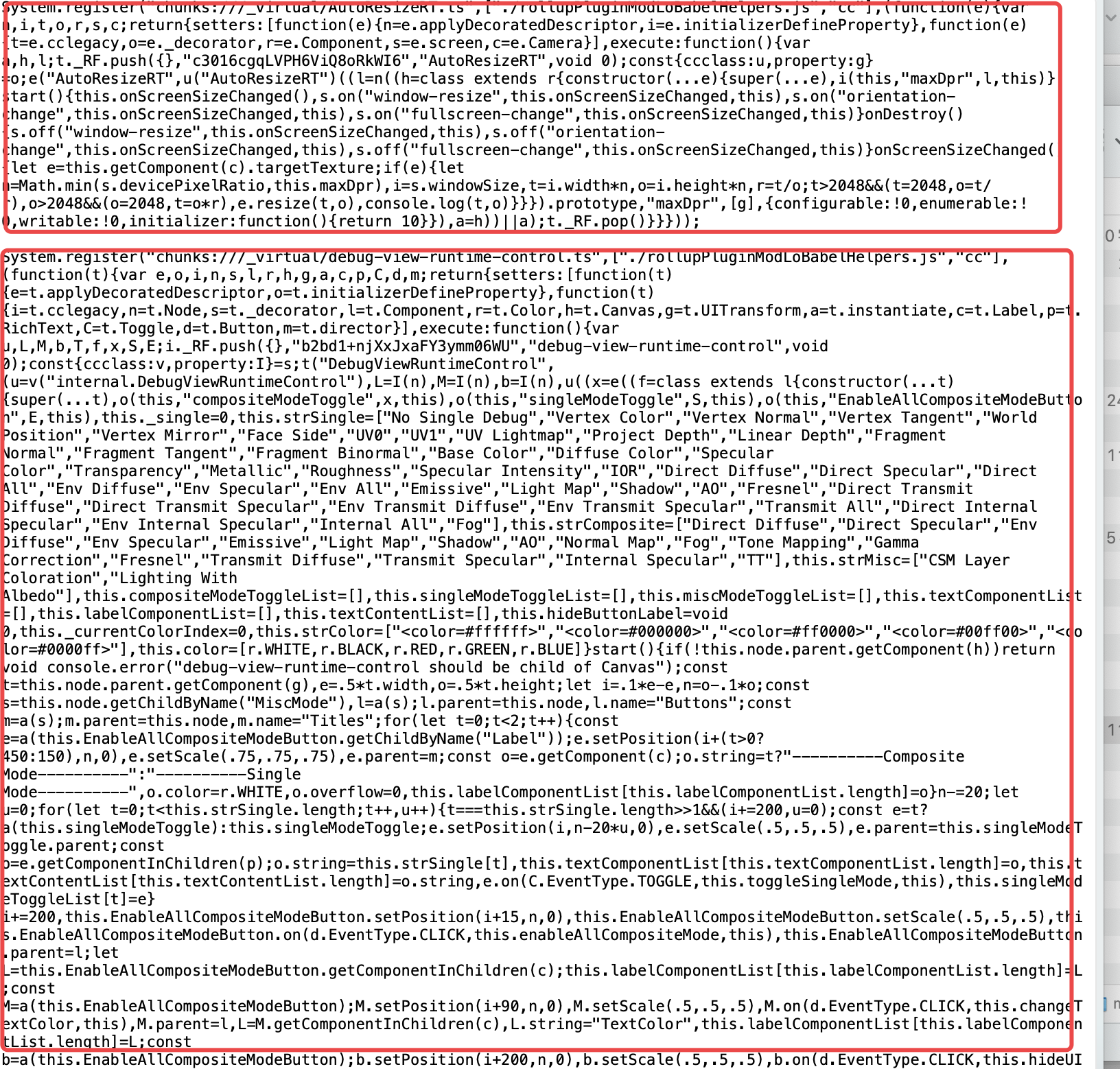 每一个system.register,是一行,比如第二个红圈内,这么多代码算作一行。有匿名方法报错了,那么报错信息只能追踪到 index.jsc 行2,只能知道是哪个类报错了,而有的脚本足有几千行,而混淆后被认为是一行,根本就无法追踪。