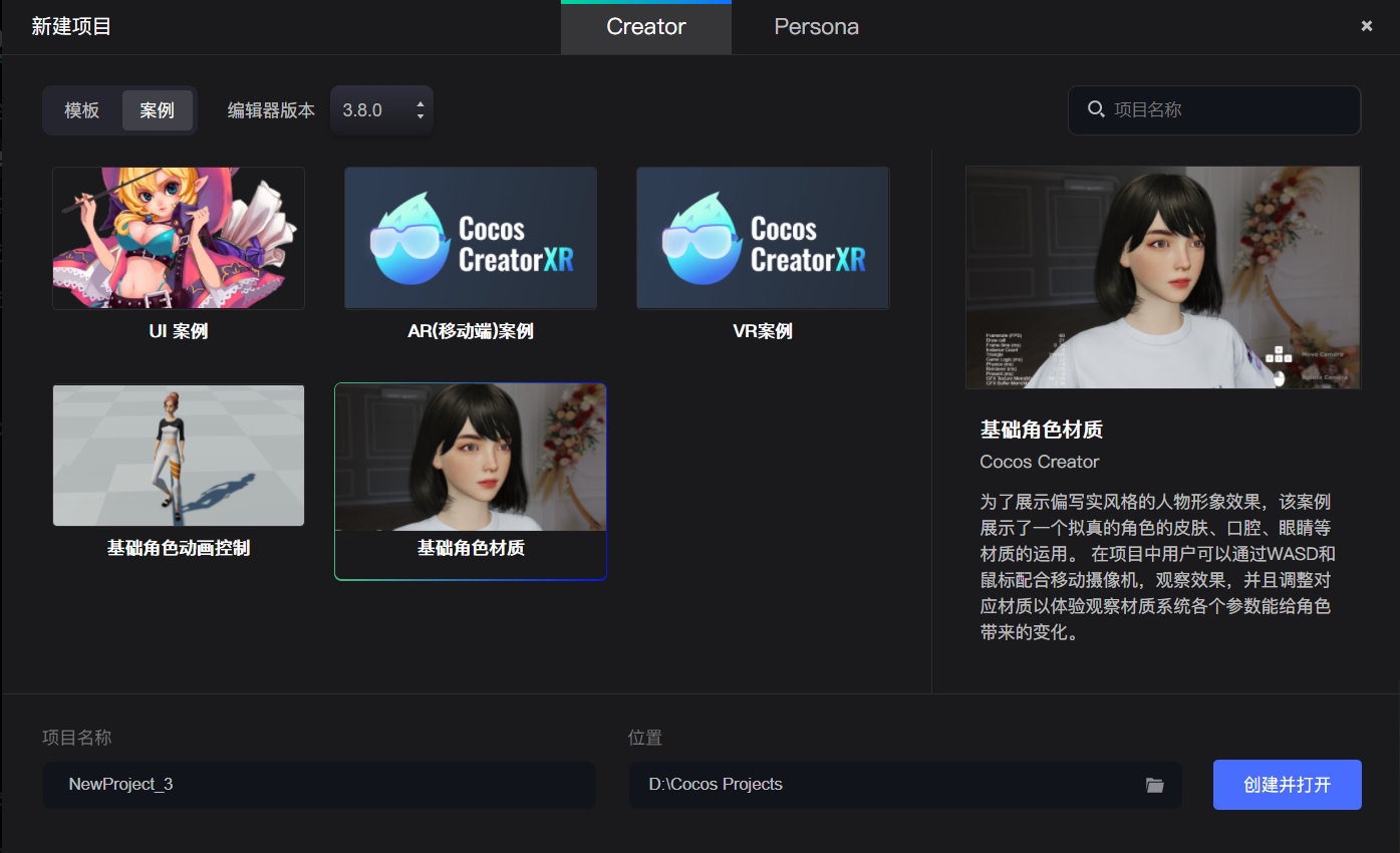 此项目依赖于3.8.0,在dashboard中,用3.8.0创建新项目时, 选择左上角的 “案例”,然后就可以在里面找到 “基础角色材质” 案例啦