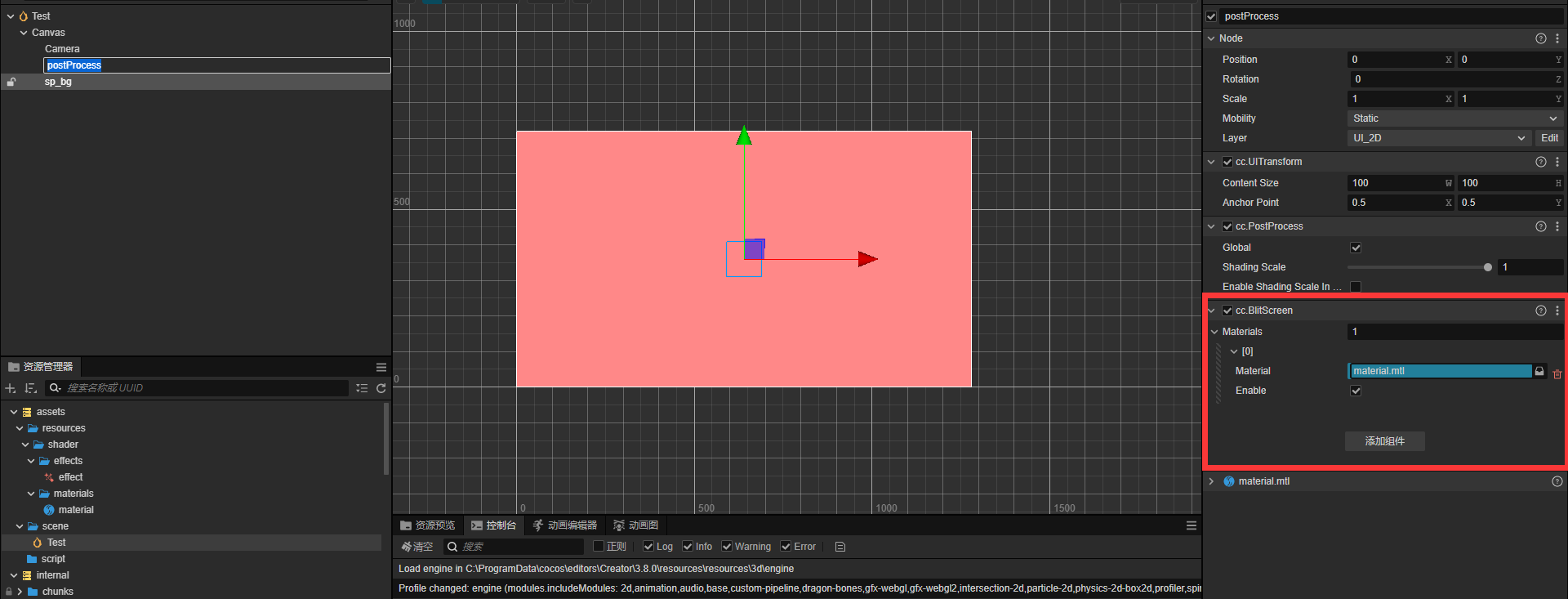 4.然后我根据教程创建了一个节点,并加了BlitScreen组件,将之前的材质拖了过去