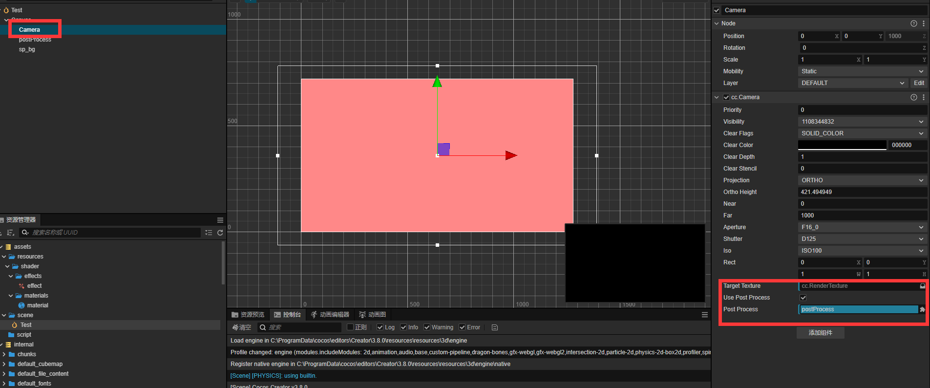 7.如果我把摄像机的 usePostProcess取消掉则可以显示红色的矩形