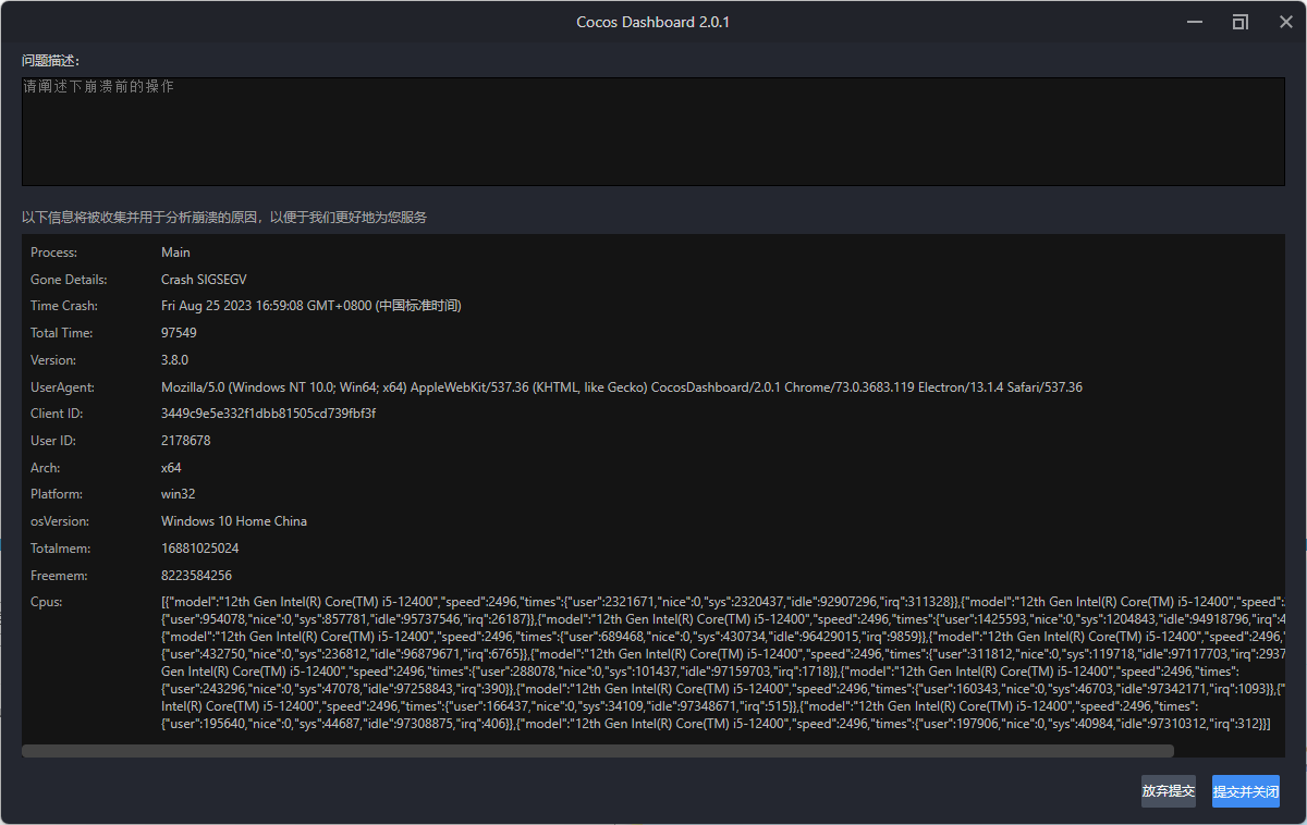 cocos3.8创建新项目,然后关闭退出,程序崩溃