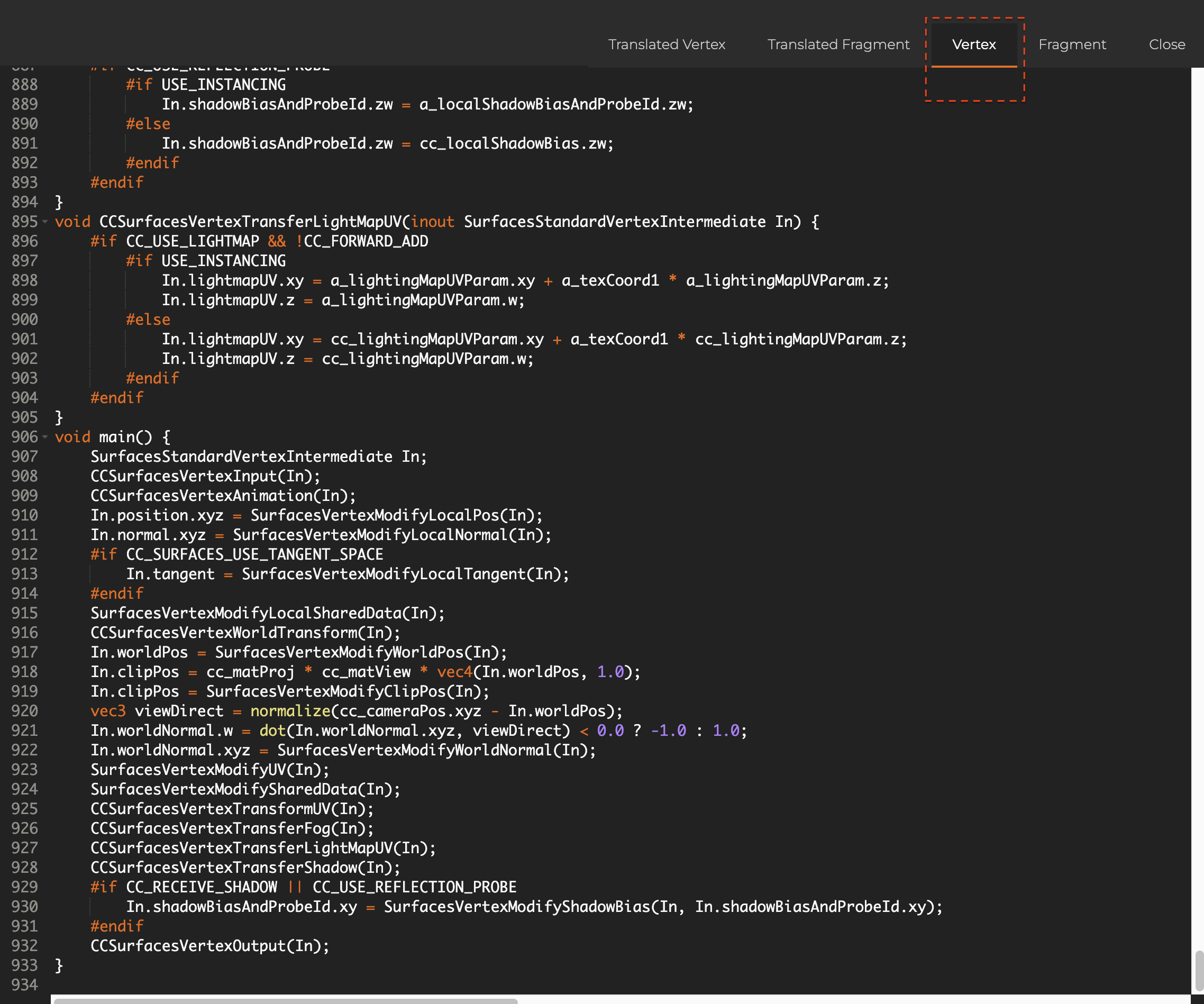 个人学习了解cocos shader相关逻辑时,最大的痛点就是宏定义和include实在太多,导致shader逻辑很难看懂。使用spectorjs可以看到draw call使用的vertex/frag的shader代码,各有两个版本,一个是包含宏定义的原始版本,另一个是解析完宏定义的精简版本(translated)。以builtin-toon渲染算法为例,原始版本有900多行,精简版本170多行,精简版本可读性好很多,当然里面还是有很多占位的空函数,但可以很容易看懂核心逻辑。