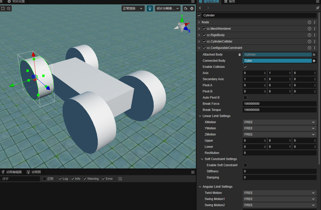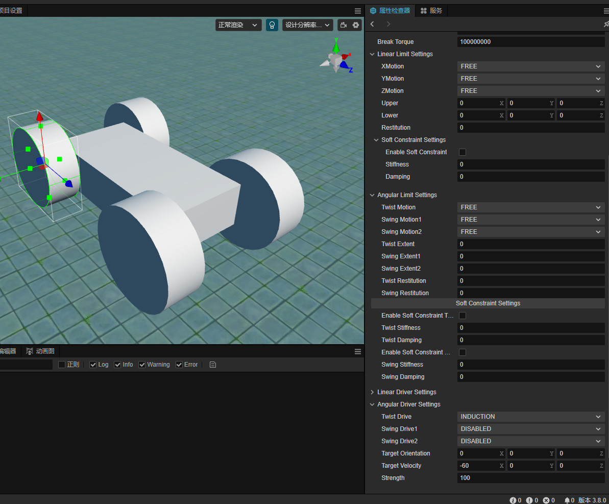 2: 铰链约束 HingeConstraint(我想把车身和轮子绑定一起运动) 如图:参数怎么调(Pivot A Pivot B Axis)我调了如图却不能动