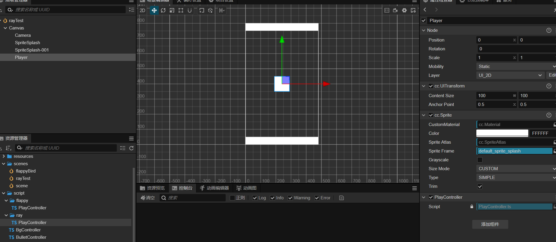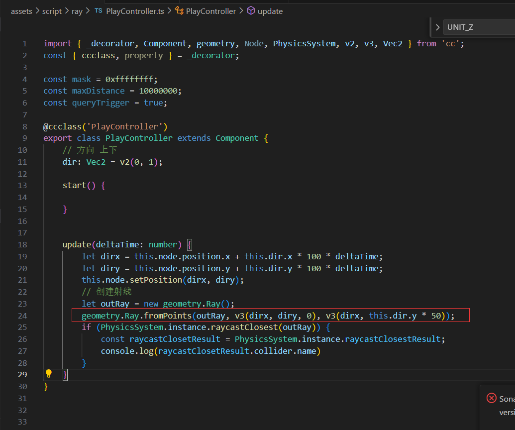 我本地练习,创建两个刚体墙,操作节点为一个单色精灵,设想是给它加射线,射线碰到墙壁后,往回走。 代码报错点截图