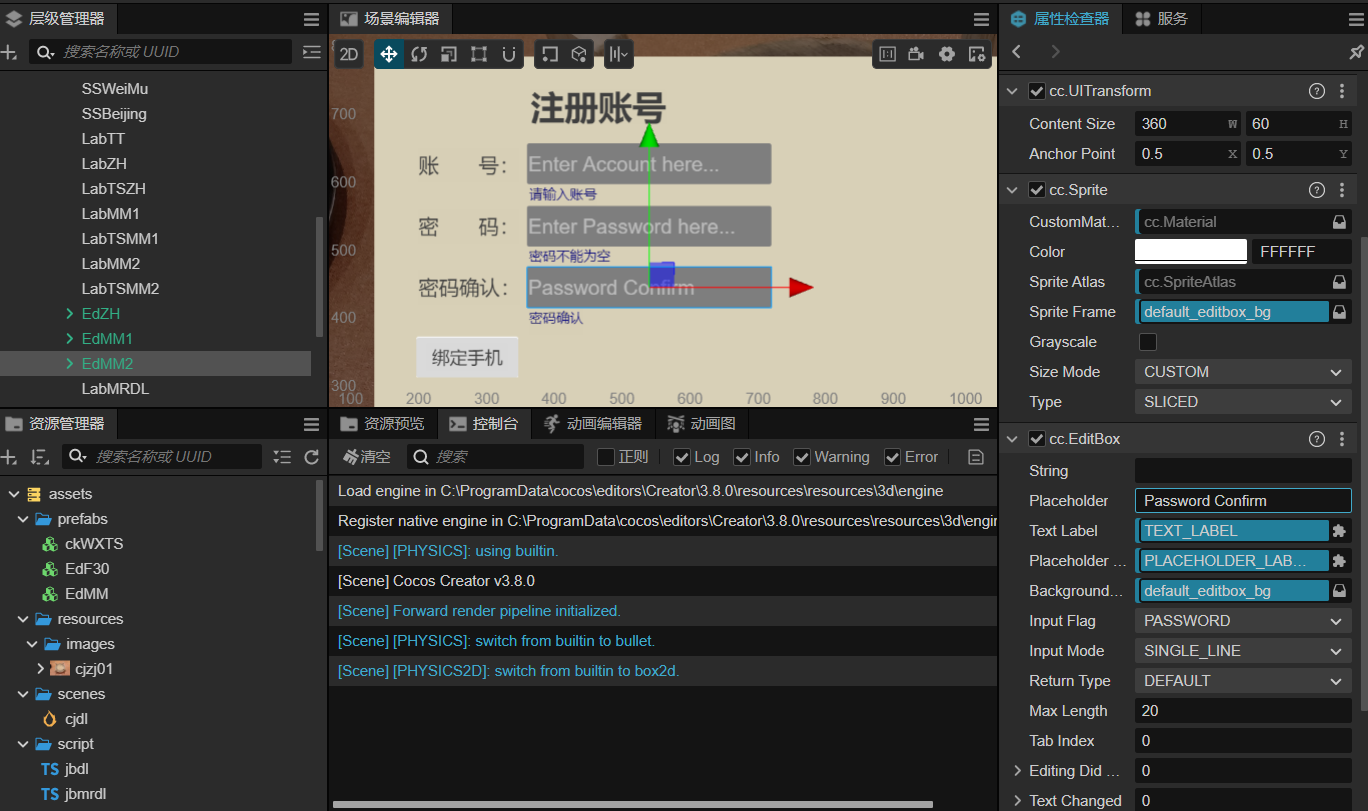 今天在做用户注册和登录界面,想到文本输入框的式样和字体都是统一的,就做了两个预制件一个是普通文本输入,一个是密码输入。然后把预制件拖到界面里,把提示信息改了:账号输入框改成“Enter Account here…”,密码确认改成:“Password Confirm”