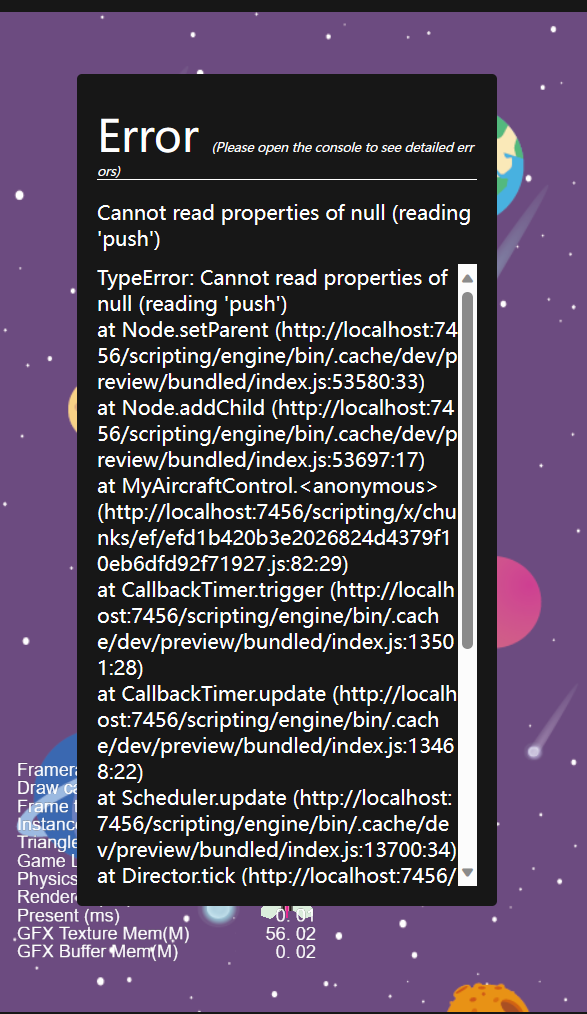 当不调用”循环发射“函数时,游戏正常运行(不过这样就只发射了一颗子弹);或者将子弹发射的间隔拉长,然后在快速移动开,让第二颗子弹不要打到已经爆炸的飞机,这样也可以正常运行(但是这样子弹发射速度太慢了)