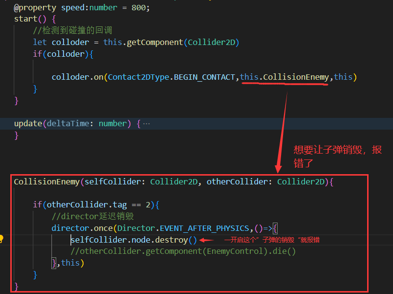 就是当把调用子弹销毁的方法后,就提示报错。排查了几个方向,最后发现是跟子弹发射速度有关