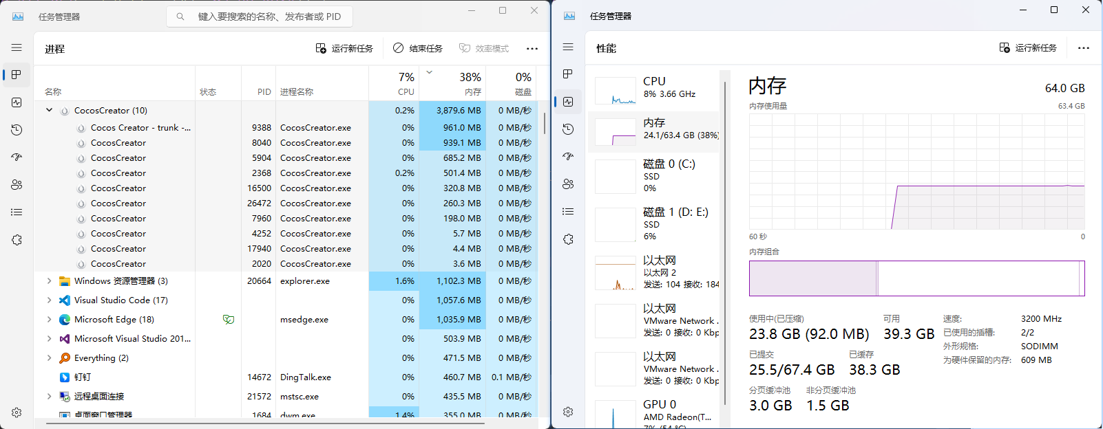 cocos 是真不把用户的电脑当电脑,我现在是16G内存电脑,玩unity/ue都行,但是一旦打开cocos,其他事情别想干。打开个ps啥的都没内存给你开。