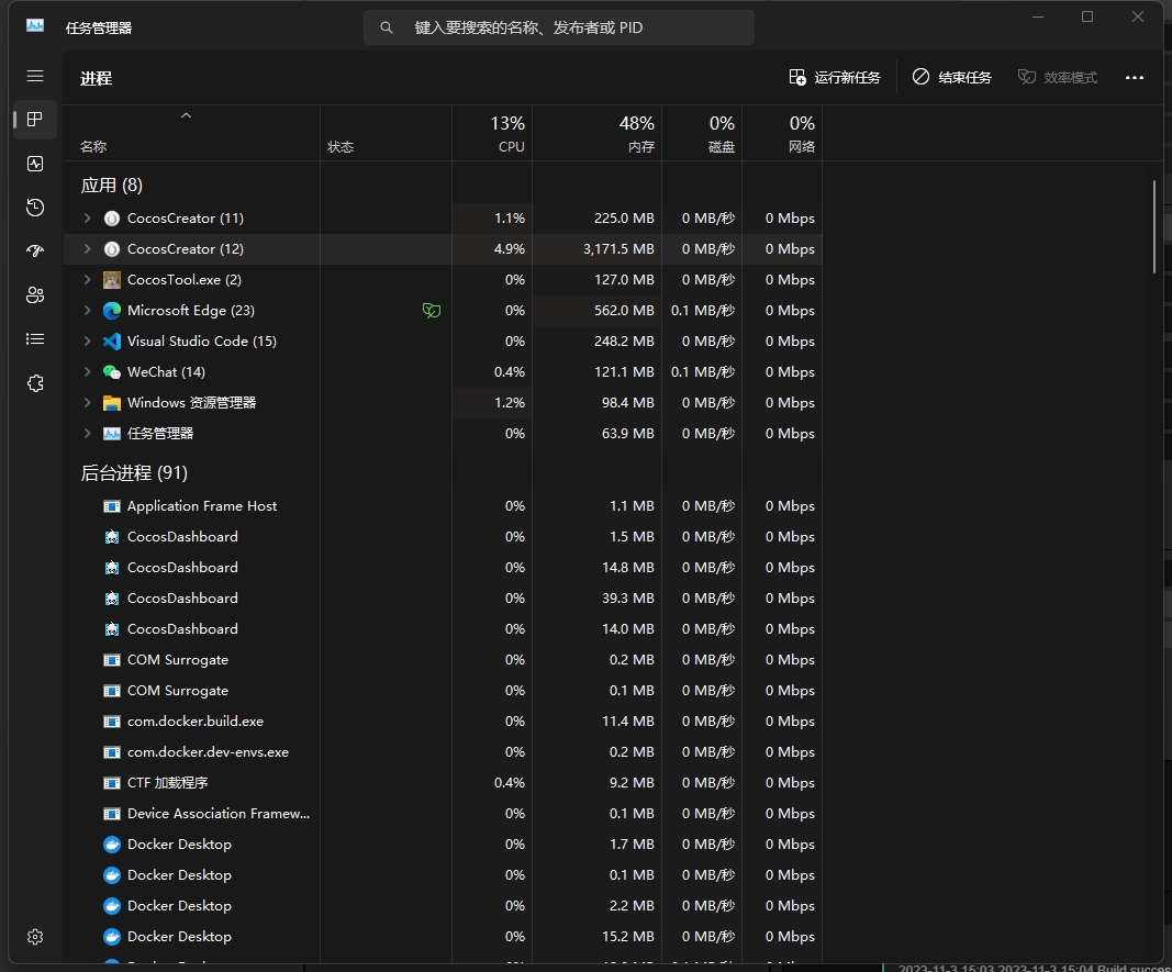 工程自然是复杂的,受影响是电脑的内存全被吃光了,其他软件没内存打不开或者打开会很慢,现在用cocos 3.8.1做项目是要经常重启的,大概4小时左右就必须重启一起,否则很难玩。会越来越卡。