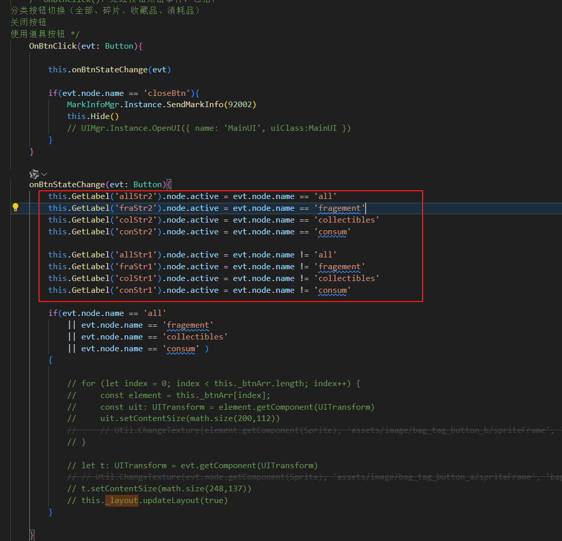 demo包太难分离了,今天又出现这个问题。目前定位到是这一段代码修改文本的active状态引起的。我注释掉这段代码就没问题。取消注释则必报这个错误,引擎版本:3.8.5。。文本就是这个背包的页签标题。我这边暂时用scheduleOnce(() => {