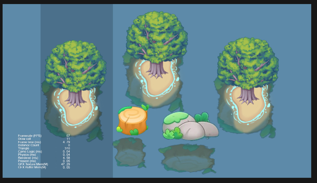 这里要提一个mesh的好处,就是勾选USE INSTANCING,可以让我们的相同材质相同mesh的物体做gpuInstancing,而且不会打断其他sprite物体的动态合批。