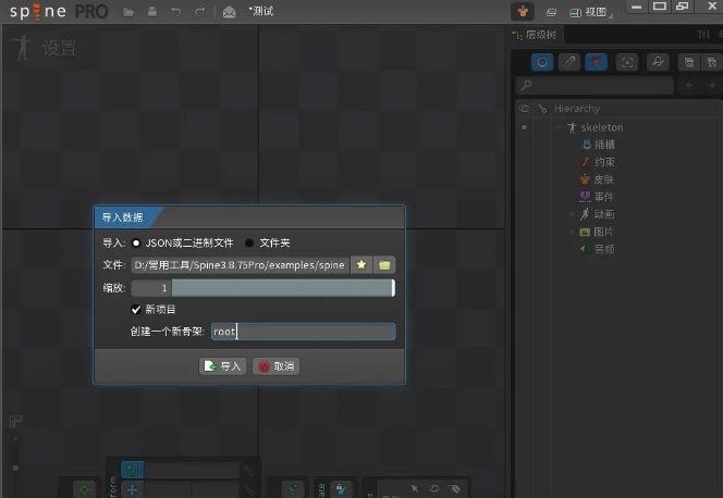 下面我们来了解一下这个软件。首先我们先把psd通过spine自带的脚本把它导入到spine中。