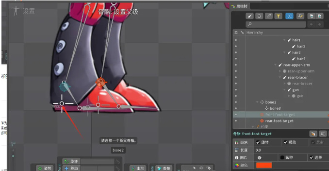 还有一个问题没有解决,那就是角色蹲下去的时候,他的双足也会跟着往下倾斜。这时候我们可以在足尖设立一个ik,然后父级设置和之前ik一样的父级。
