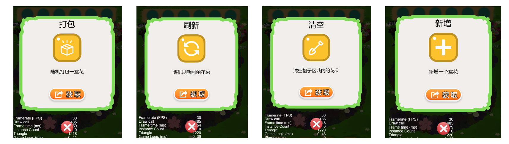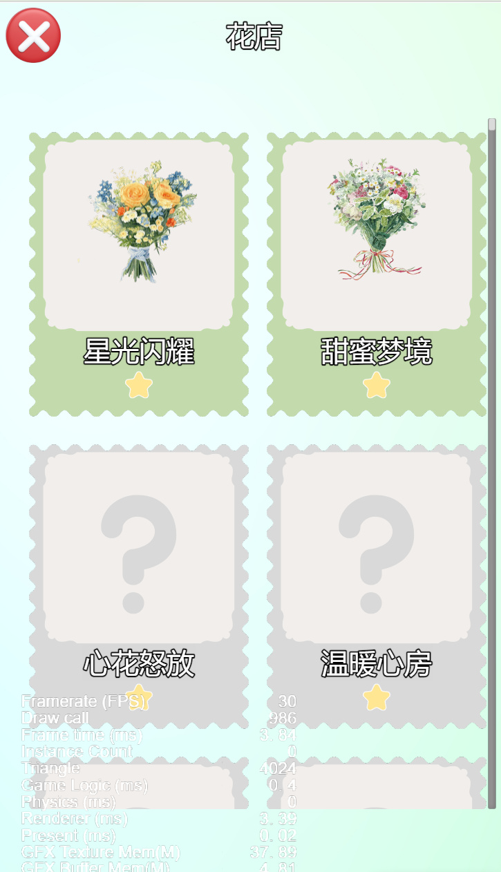 最后就是花束列表,这里如果列表节点非常多,则会比较卡,比较好的做法是用虚拟列表,开源社区也有比较成熟的组件(https://github.com/gh-kL/cocoscreator-list) 。目前我还没来得及做,后面优化。