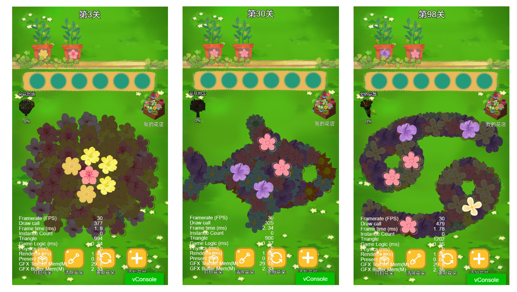 以上就是核心的花朵堆叠渲染和消除逻辑,在开发过程中,还遇到一点比较有意思的地方,就是消除花朵解锁花束的进度实现。简单理解就是一个进度条progressbar,理论上是可以用progressbar,但我这次没用,下次专门花点时间讲讲进度条。进度条的纹理要动态变化,不同关卡要解锁的花束不一样。