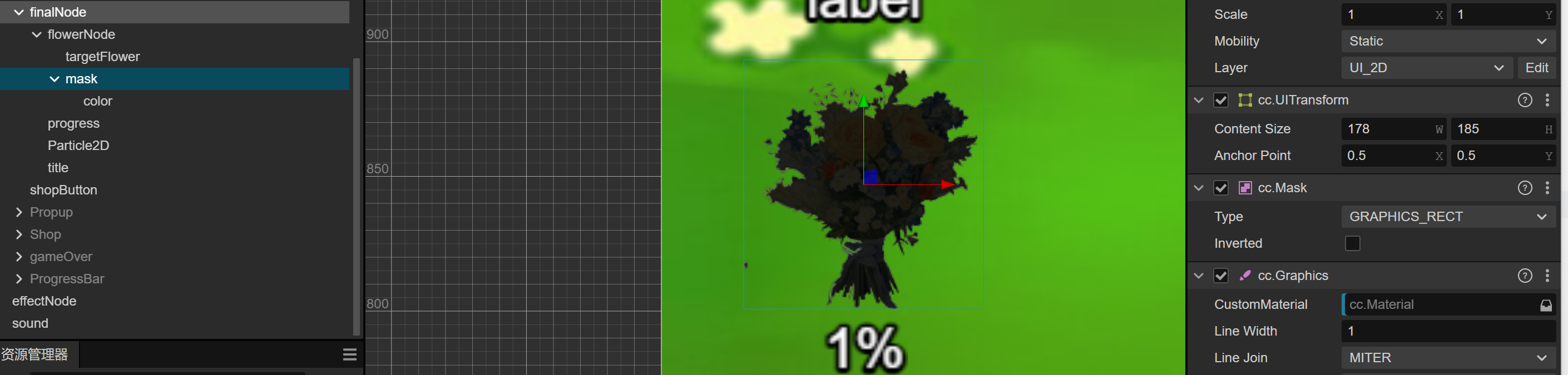 处理方式是两层结构,targetFlower和mask是出于同一层级,然后mask的子节点color是黑色的花束,设置节点color为黑色,遮罩类型为矩形,动态改变遮罩的宽高,targetFlower是原色花束,被遮罩节点叠在上面。